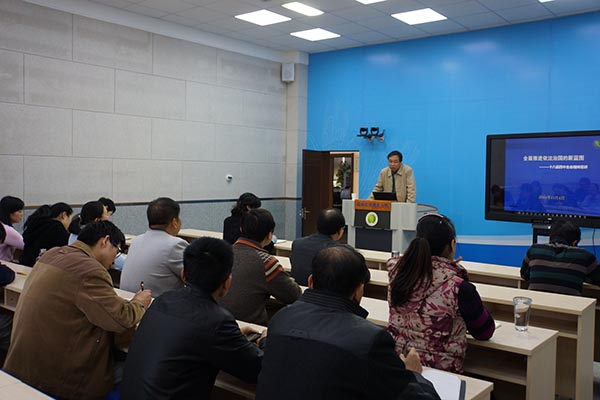 网教中心副主任、支部书记张晓丽在主持报告会时强调,党的十八届四中全会10月20-23日召开,是我国全面建成小康社会进入决定性阶段、全面深化改革进入攻坚期和深水区重要关头召开的一次具有里程碑意义的重要会议。方建斌教授的报告既有深入的理论思考,又有丰富的信息素材,对于我们深刻领会四中全会《决定》和习近平总书记重要讲话精神,准确把握全面推进依法治国的新思想新举措和伟大意义,是一次很好的辅导和解读。要求报告会后,党员干部要结合网络工作实际,认真学习近平总书记的讲话和《决定》原文,深刻领会四中全会精神,增强走中国特色社会主义法治道路、依法办学的自觉性。