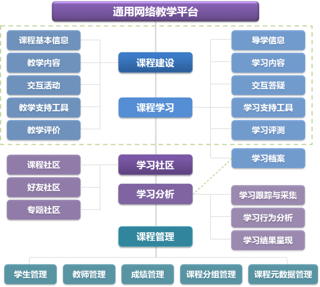 通用网络教学平台系统支持按照知识单元建设课程,具有教学内容组织与管理、互动答疑、教学评价与评测、学习社区、学习分析、课程管理等丰富功能;可以支持包括网络辅助教学、网络混合式教学(MOOC、翻转课堂等)和纯在线课程等不同教学模式。