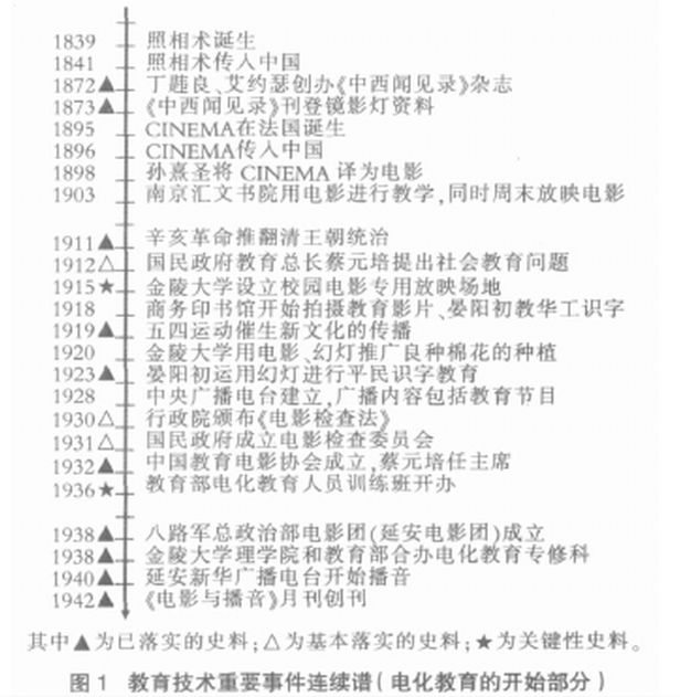 我们认为,电化教育是我国现代教育技术的具体代表,是教育技术整个发展过程中的一个重要的阶段。电化教育不是凭空产生的,在它之前或之后,都有着与其相关的、千丝万缕联系的众多事件。图1展示的是我们团队完成的一幅《教育技术重要事件连续谱》中“电化教育”开始部分的内容,从中可以看到许多与电化教育相关的事件。
