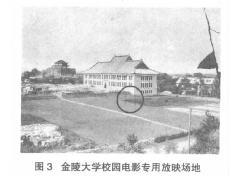 金陵大学从它的前身汇文书院开始就一直使用幻灯、电影进行教学,并在周末放映电影,但这些活动还没有得到充足的史料来支持。在研究过程中,我们从美国耶鲁大学图书馆得到了下面这张拍摄于1915 年的老照片,它展示了金陵大学新校址上第一座教学大楼——东大楼落成时的景象。在大楼的右前方有一块平整的场地,在场地的一端,我们可以清楚地看到竖立着两根木杆(见图3 中圆框内)。