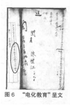 两委员会行政建制在教育部内归“社会教育司”分管,司长陈礼江为管理的便利和行文的简洁,将“电影教育与播音教育”两委员会简化为“电化教育委员会”,更进一步简化成“电教会”,潘澄侯的职务也就随之成为“电教会秘书”(见图4 黑框内的文字与签名)。至此,“电化教育”与“电教”在我国正式成为官方确认的、内涵包括“电影教育和播音教育”的专用术语。