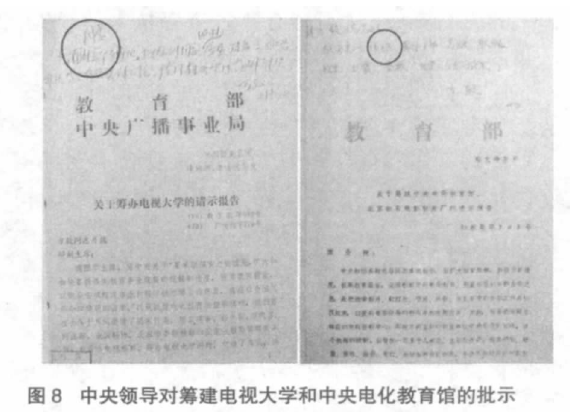 1977 年,电化教育重新起步,得到党中央和国务院的高度重视。1978 年,邓小平同志代表党中央先后同意筹建电视大学和中央电化教育馆。从图8 中两份文件上可以看到邓小平同志画圈同意的笔迹。