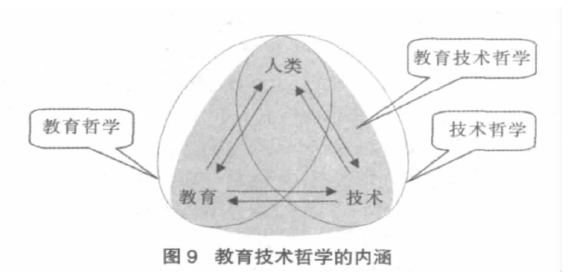 教育哲学是研究教育在人类社会中的价值的科学,主要涉及人与教育的关系;技术哲学是研究技术在人类社会中的价值的科学,主要涉及人与技术的关系。教育技术哲学则是研究技术在促进教育发展中的价值的科学,它的主体是人,如图9 中阴影部分所示。所以,我们只有把握好人的主体地位,处理好技术与教育的正确关系,才能正确理解教育技术的内涵。