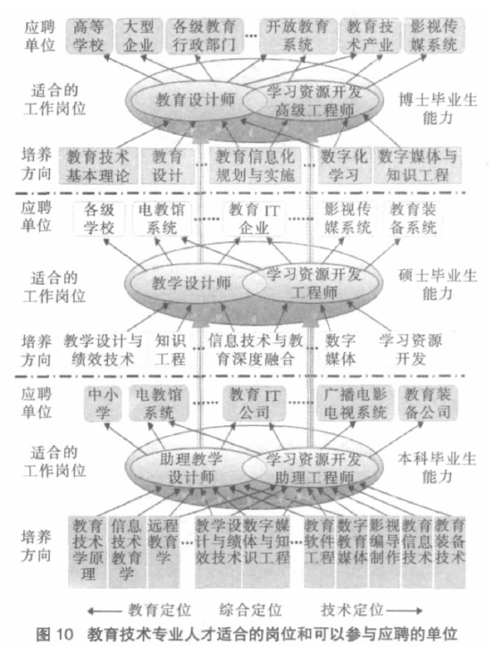 图10 给出了教育技术不同层次的专业人才适合的岗位和可以参加应聘单位的关系图,从图中可以看出就业前景是非常鼓舞人心的。师范类院校、综合大学和单科(工科、农科、医科)院校的教育技术学专业都可以按照社会需求和自己的办学优势确定专业方向,毕业生才能有自己的专长,有利于就业和考研深造;教育技术学专业才能摆脱当前逐渐萎缩的状态。