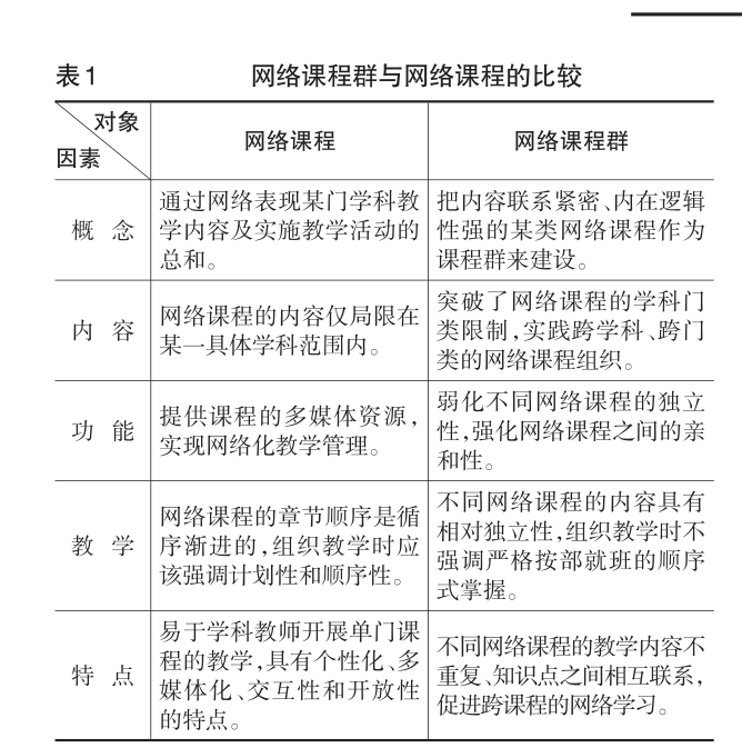 随着同类课程数量的不断增加,知识雷同、内容重复等问题难以避免。传统的网络课程理论侧重于将网络课程视为静态的知识体系,较多关注单门网络课程的设计开发与教学应用状况。而网络课程群则可以打破单一网络课程视角的认识局限,有助于人们思考网络课程之间的关系,促进相关网络课程整体教学效应的提升。网络课程群与网络课程的比较见表1。网络课程群还可以优化与整合不同的网络课程,“使课程设置、课程内容、教学设备、师资队伍、教学思想、教学方式方法等在教学系统中更好地得到优化,从而达到加强联系、减少重复、压缩课时、增加效果等功效。” (吴开亮,1999)